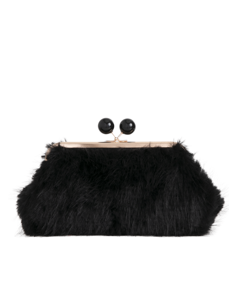 Black Fluffy Faux Fur Kiss Lock Clutch Bag