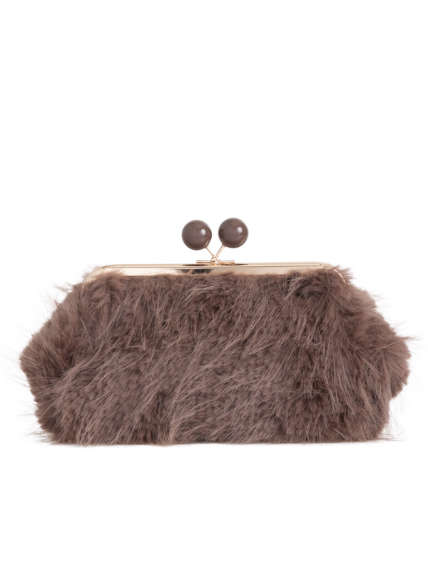 Coffee Brown Fluffy Faux Fur Kiss Lock Clutch Bag