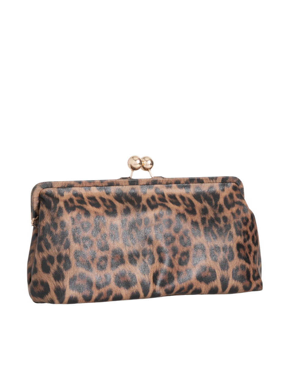 Oversized Faux Leopard Leather Kiss Lock Clutch Bag