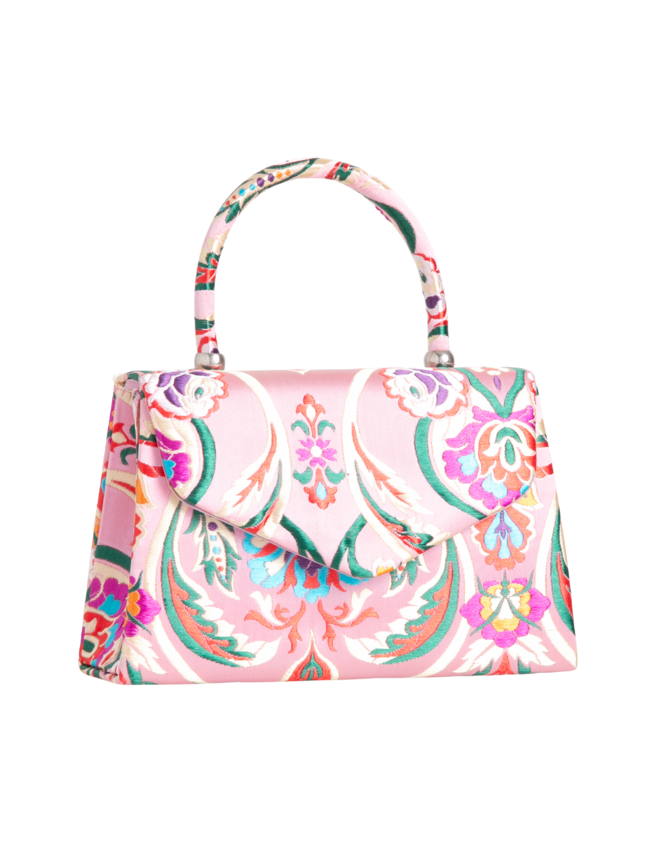 Elevate your outfit with this elegant Pink Satin Jacquard Print Handbag, designed for timeless sophistication. Made from satin effect fabric with an intricate colourful jacquard pattern, this bag adds a refined touch to any occasion... from evening dinners to special celebrations.